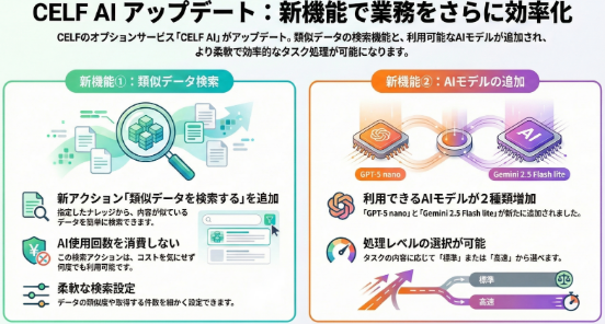 CELF AIに「類似データを検索する」機能が加わり、例えば過去の伝票や見積り、契約データなどから似たレコードを自動検索できるようになりました。加えて、AIに作業を依頼する際のAIモデル選択肢として「GPT-5 nano」「Gemini 2.5 Flash lite」が追加され、処理速度や精度の要件に応じた使い分けが可能になっています。