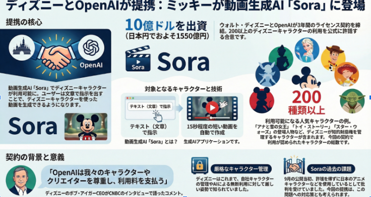 ディズニーはOpenAIと3年間のライセンス契約を結び、動画生成アプリ「Sora」でミッキーマウスなど200以上の公式キャラクター利用を認めた。加えて約10億ドルを出資し、単なる実験ではなく事業前提の提携に踏み込んだ。無断利用への批判が強かった生成動画領域で、「権利処理込み」が前提条件になりつつあることを示している。
