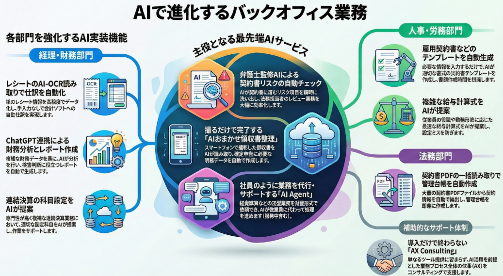 経理・財務:レシートのAI-OCR読み取りによる自動仕訳、ChatGPT連携による財務分析・レポート作成、連結決算の科目自動提案など。