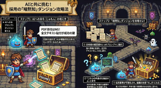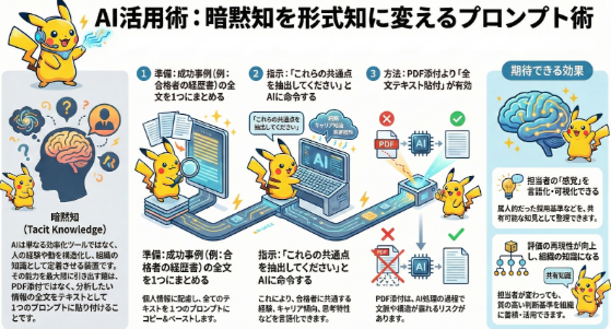 その代表例が採用業務だ。採用担当者が感覚的に行っている「この人は通る」「この人は合わない」といった判断は、長年の経験に基づく暗黙知であることが多い。合格者の履歴書・職務経歴書をテキスト化し、1つのプロンプトとしてAIに渡すことで、「合格者に共通する経験」「キャリアの傾向」「思考特性」などを言語化・整理できる。