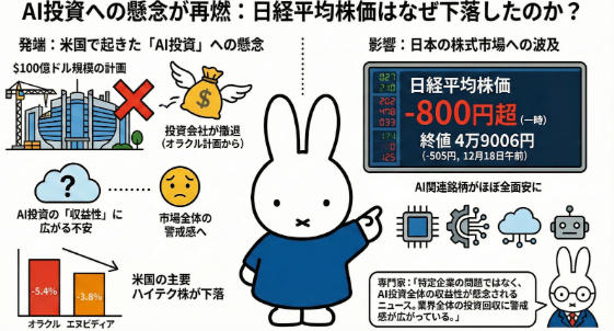 AI向けインフラ投資は続く前提だったが、「そのリターンは誰が、いつ得るのか」が改めて問われた。オラクルの案件は個社要因とされつつも、投資回収モデルそのものへの不安が再燃し、株式市場全体に波及した。日本株はAI関連への依存度の高さが裏目に出た。今回の下落は技術競争ではなく、AIインフラ投資の収益性に疑問符が付いたことが本質だ。巨額投資を前提にした成長ストーリーに、金融市場が一度立ち止まった形となった。AI関連は「必要」でも「儲かるか」は別、という視点が前面に出ている。