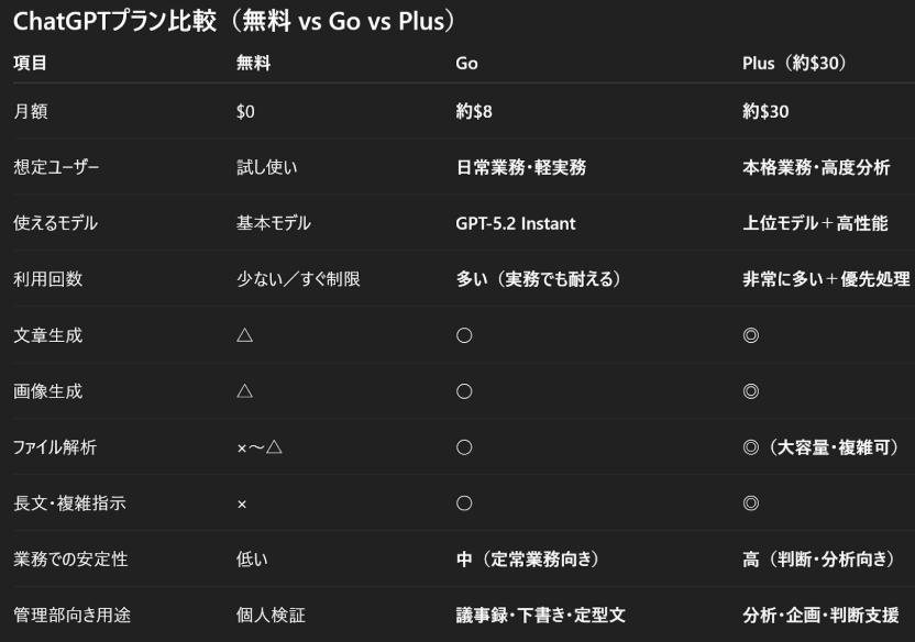 ChatGPTプラン比較(無料 vs Go vs Plus)は以下参照ください。