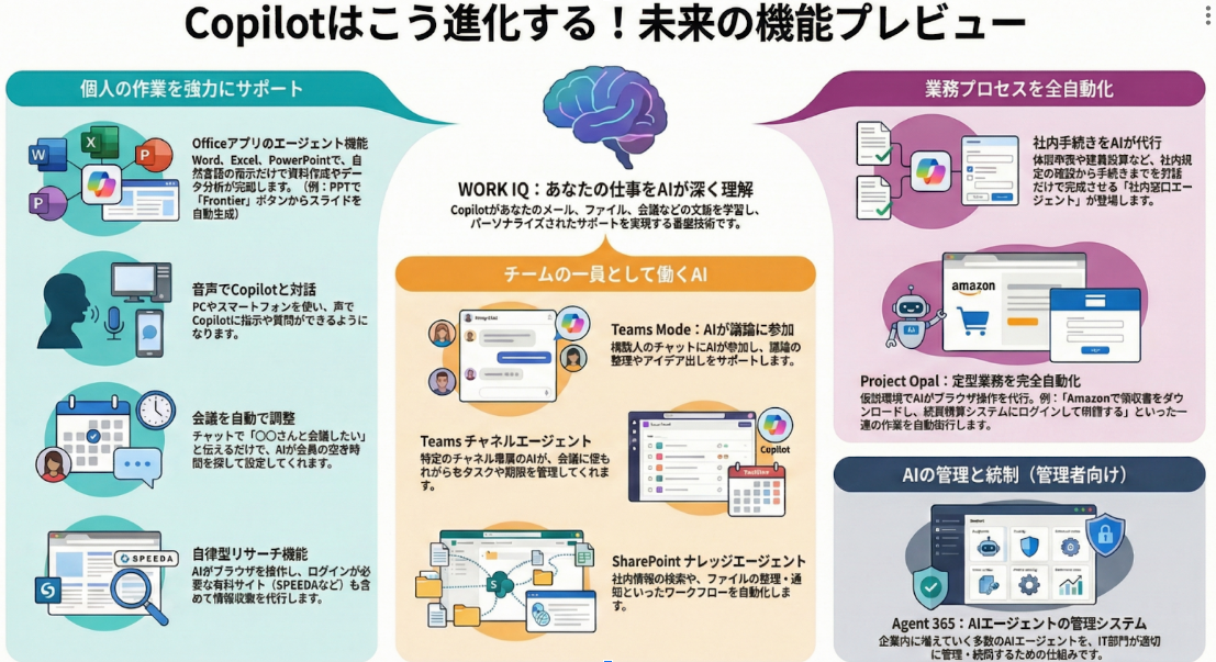 【重要なお知らせ】 今回ご紹介する機能の多くは、現在**「Frontier Program(フロンティア・プログラム)」と呼ばれる先行プレビュー版(一部の企業向け)で提供されているものです。 そのため、通常のCopilot有料版ユーザーの方は現時点ではまだご利用いただけない機能がほとんどです。 「将来的にCopilotがこのように進化し、こんなことができるようになる」という未来の機能のプレビュー**という視点でご覧ください。