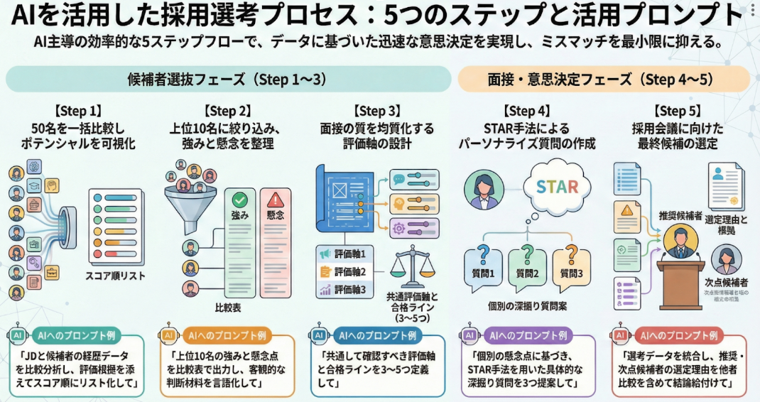 「これまでの選考評価データに基づき、最終的な『推奨候補者』と『次点候補者』を選定してください。 採用会議でステークホルダー(決裁者)を説得するために、なぜこの候補者が最適なのか、他の候補者と比較して何が優れているのかを結論としてまとめてください。」